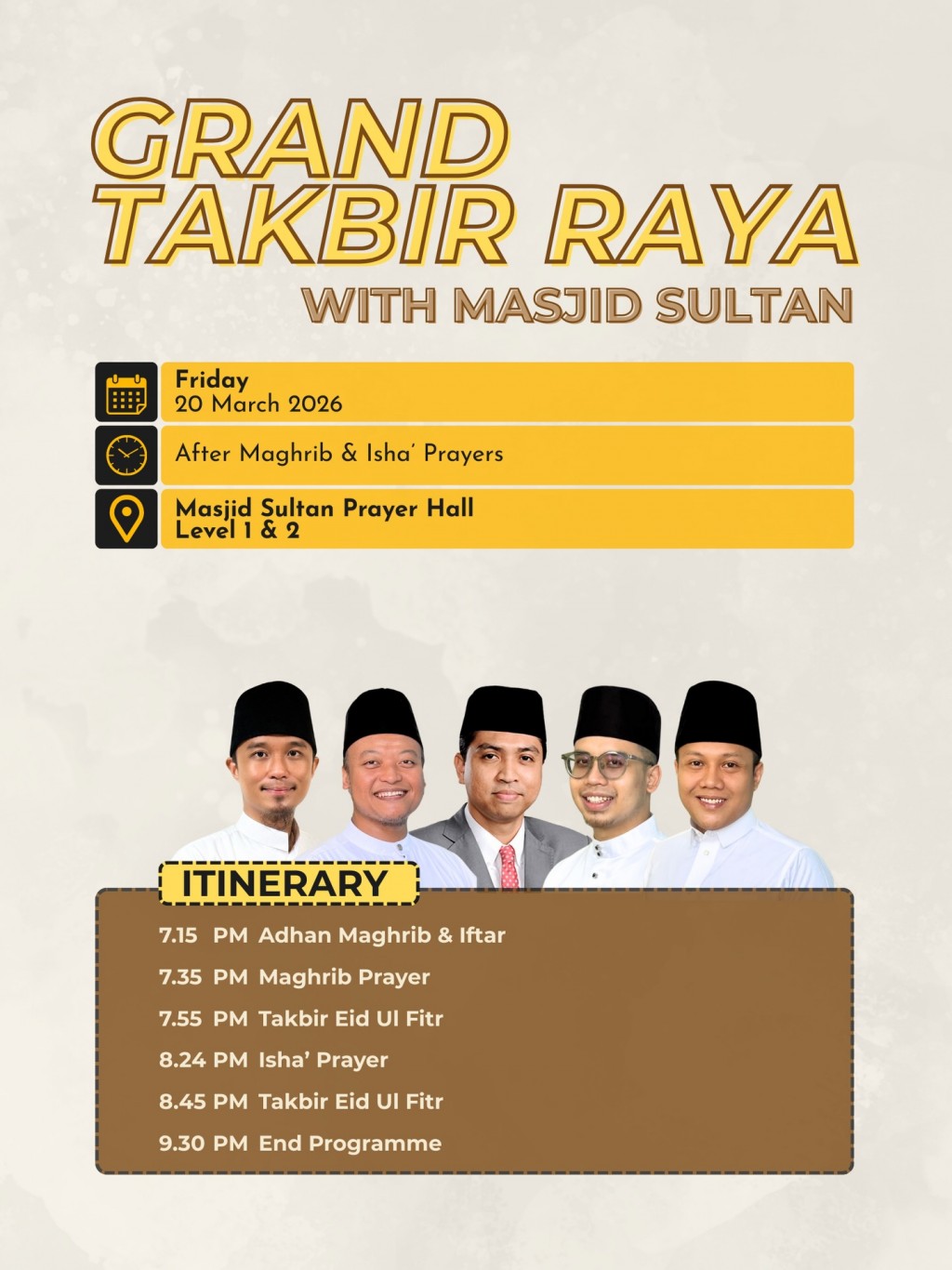 20 Mar, 2026 From 7:15 PM to 9:30 PM Masjid Sultan Prayer Hall, Level 1 & 2, Singapore View MapEvent will be conducted in English